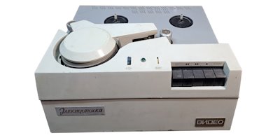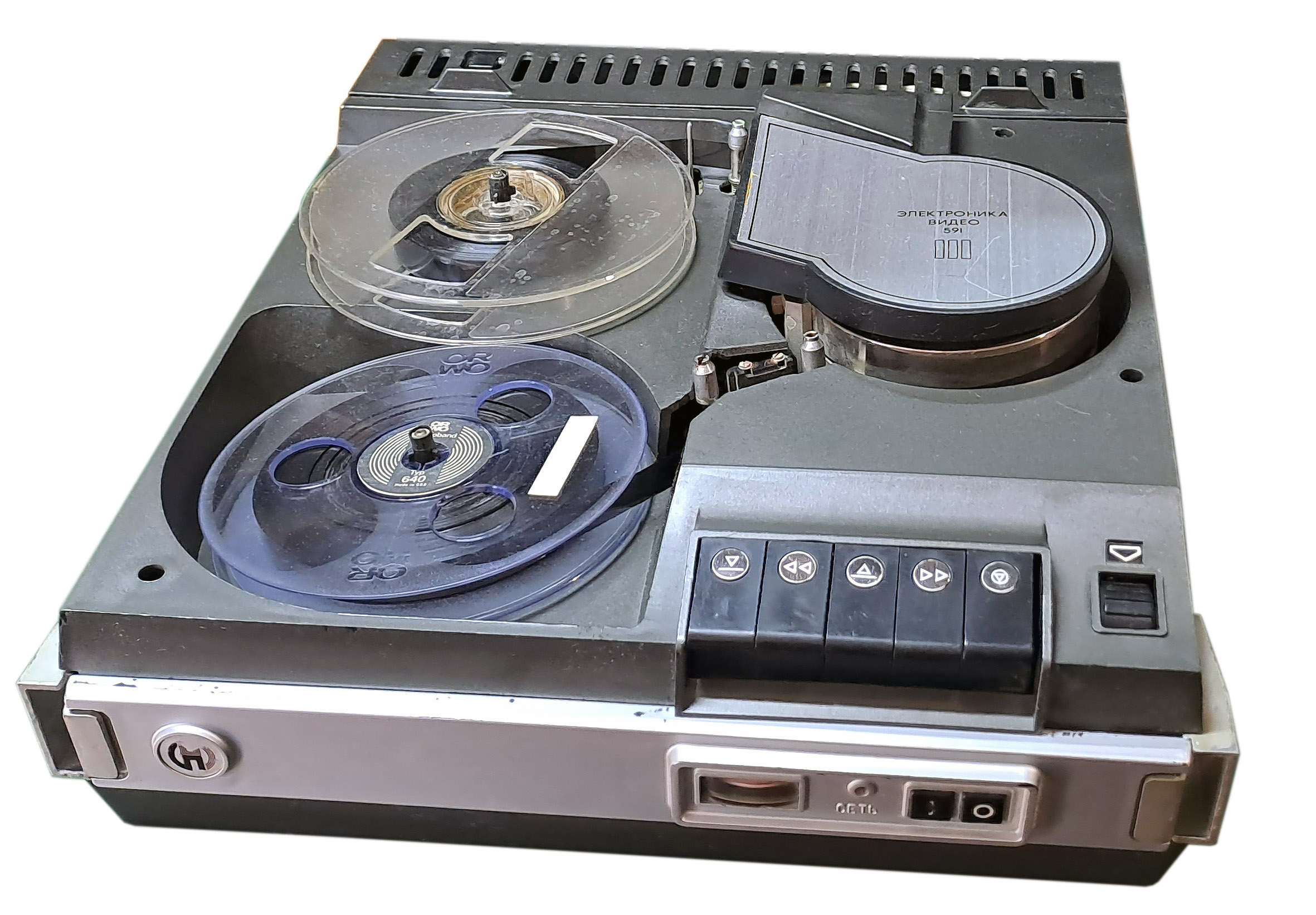 Советский полукадровый видеомагнитофон производства НПО "Позитрон". Черно-белый, имеет цельнометаллический корпус.