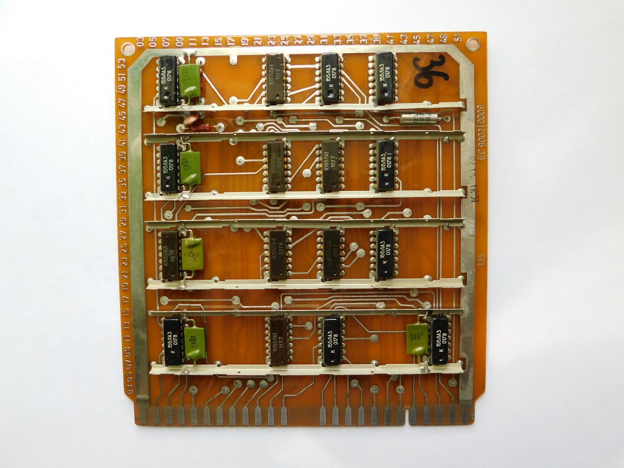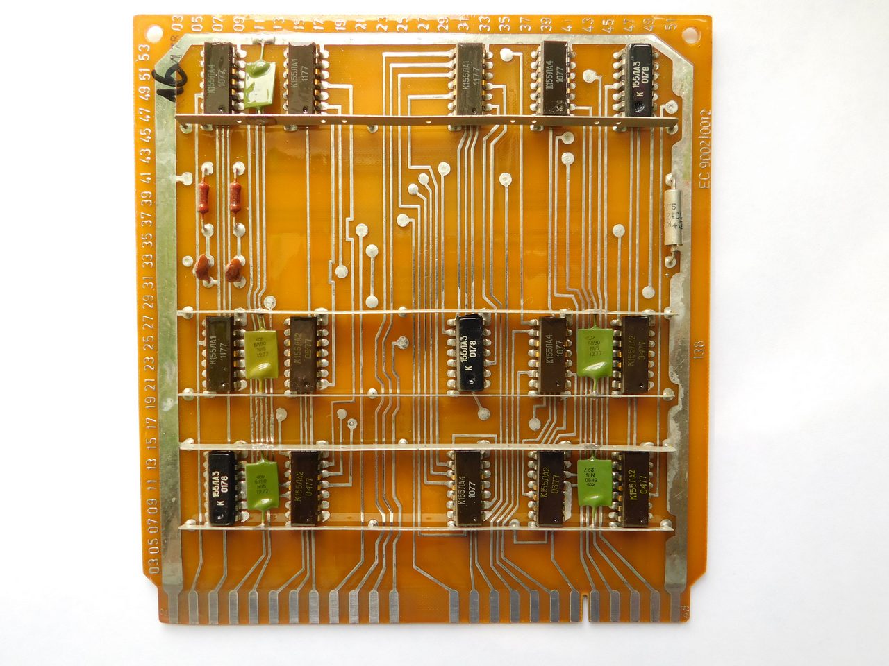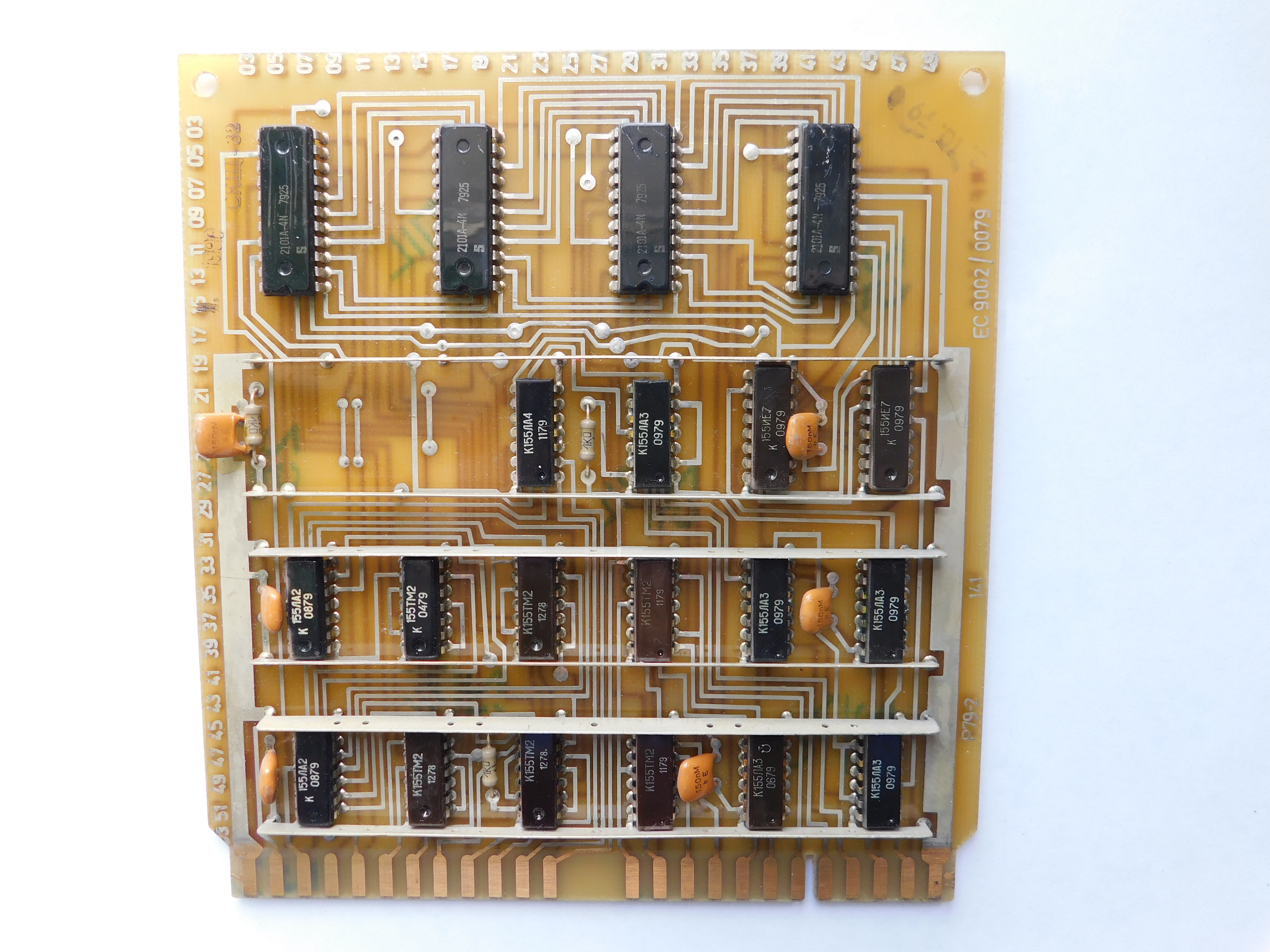 Пример платы. Номенклатура электронных компонентов ограничивается микросхемами стандартной TTL логики советского и производства соц.стран. Транзисторы и диоды в основном несоветского производства. Питание к каждой микросхеме подводится с помощью шины, которая напаяна над платой и на которую запаиваются блокировочные конденсаторы. Это стандартная практика в платах от ЭВМ и устройств Единой Серии (ЕС). По размерам эта плата является стандартной для машин ЕС и соответственно может быть вставлена в любое другое устройство, так как имеет ту же конструкцию разъема.