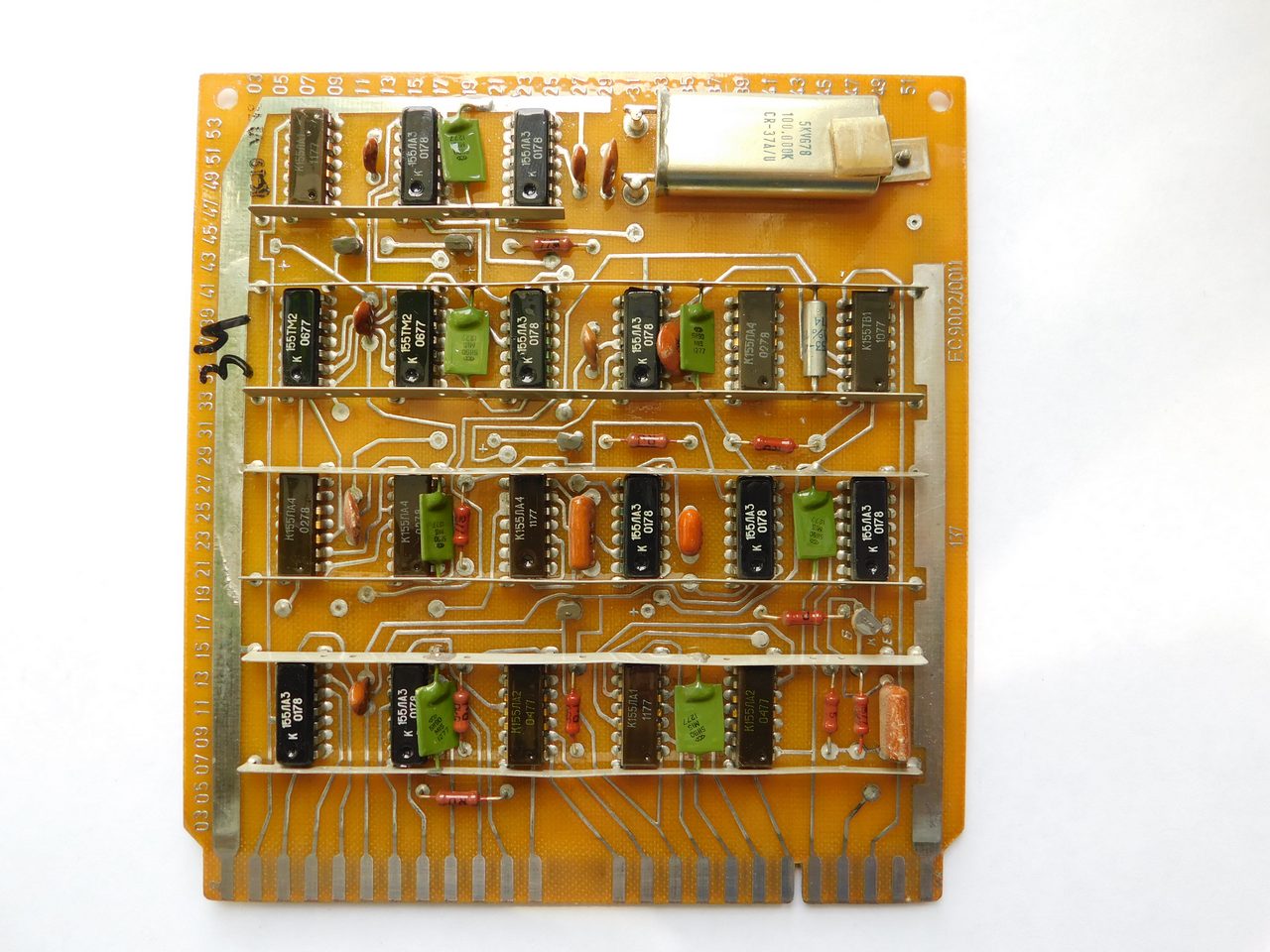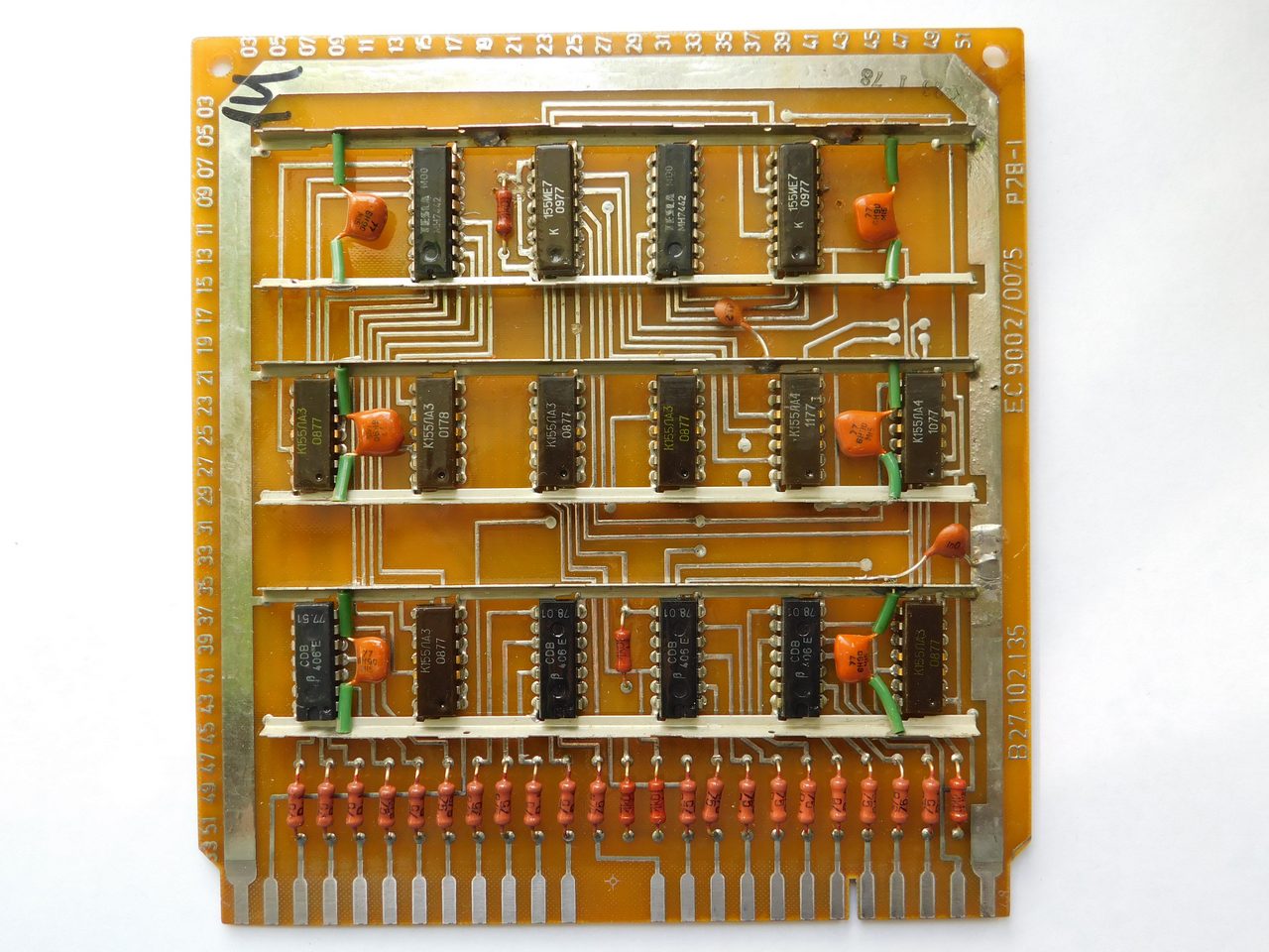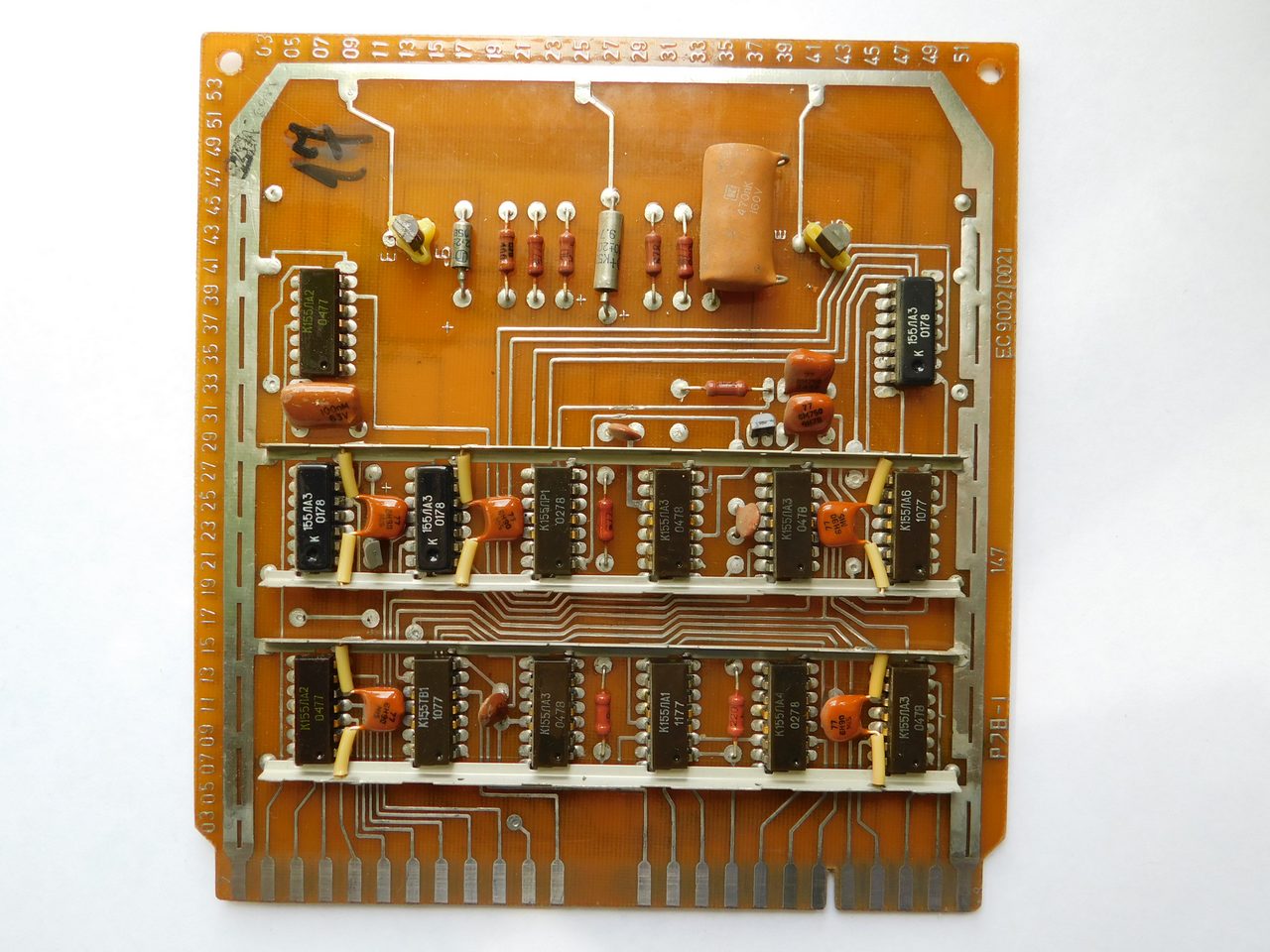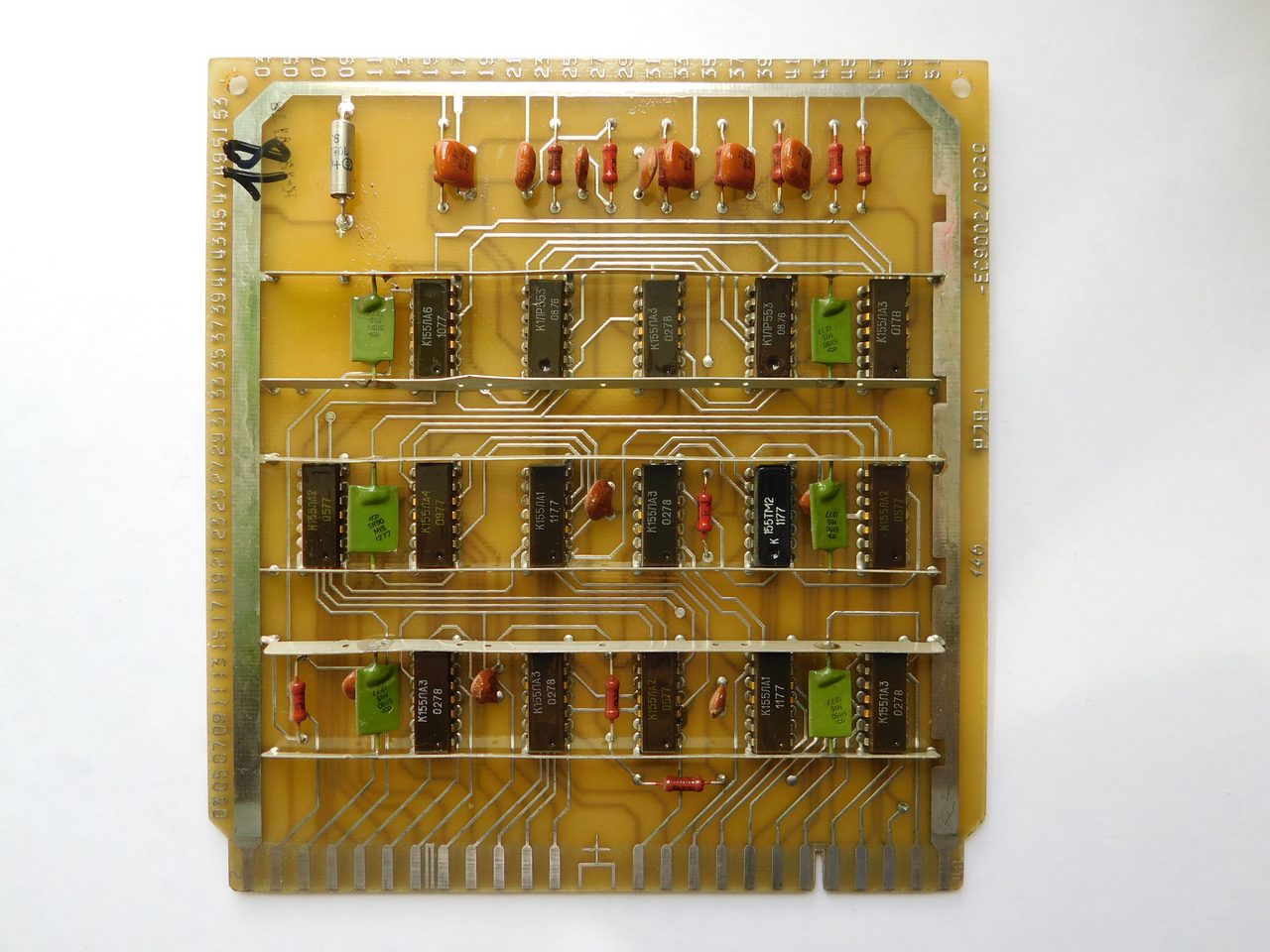 Пример платы. Номенклатура электронных компонентов ограничивается микросхемами стандартной TTL логики советского и производства соц.стран. Транзисторы и диоды в основном несоветского производства. Питание к каждой микросхеме подводится с помощью шины, которая напаяна над платой и на которую запаиваются блокировочные конденсаторы. Это стандартная практика в платах от ЭВМ и устройств Единой Серии (ЕС). По размерам эта плата является стандартной для машин ЕС и соответственно может быть вставлена в любое другое устройство, так как имеет ту же конструкцию разъема.