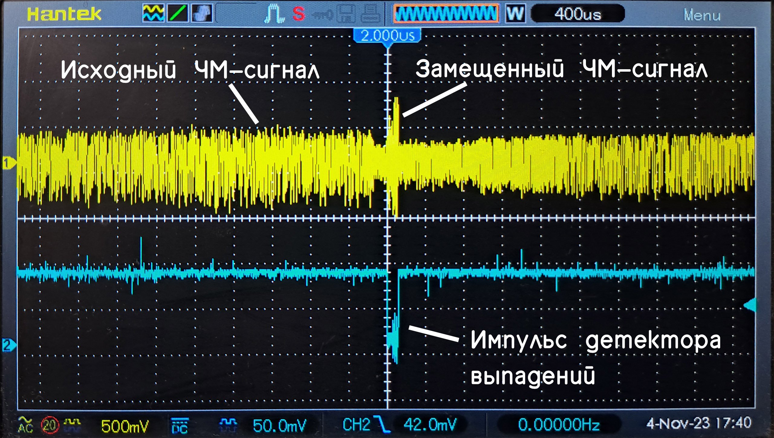 На практике при первом запуске схемы пришлось также подстраивать резистор R57. Он задает амплитуду замещенного ЧМ-сигнала. В первый раз я собрал с номиналом, который указан на оригинальной схеме, но на практике оказалось, что замещенный сигнал сильно больше по амплитуде, чем исходный. Для видеомагнитофона это оказалось неприемлемо, вместо замещенного сигнала были черные полосы. В представленной схеме R57 показан с уже подобранным сопротивлением. Однако, если будет виден разбег в амплитуде на осциллографе (если синхронизировать осциллограф от импульса детектора), то можно подстроить этот резистор, чтобы выровнять уровни замещенного и исходного ЧМ-сигналов.