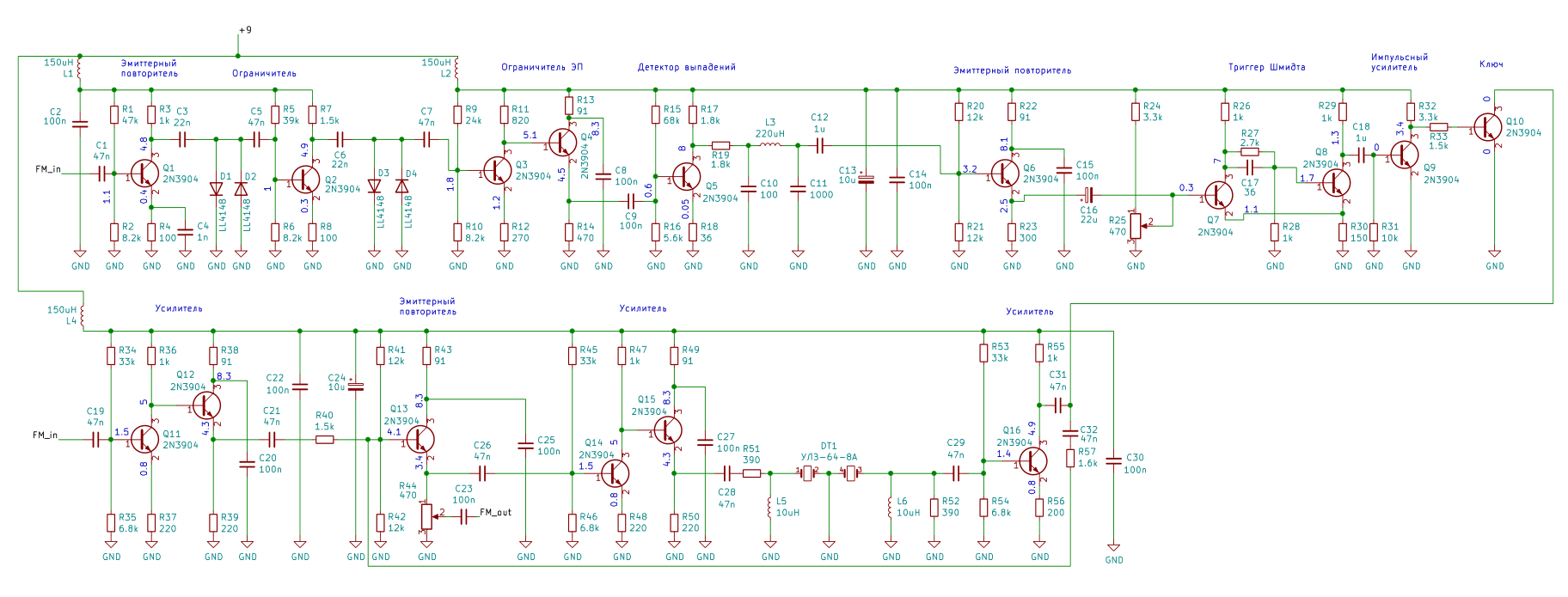 С выхода ЛЗ задержанный ЧМ-сигнал усиливается на транзисторе VT16. Сигнал снимается с коллектора через конденсатора С31. С другой стороны сигнал может пройти через цепочку C32-R57 на базу транзистора VT13, который пропустит задержанный ЧМ-сигнал на выход компенсатора. Но после С31 подключен коллектор транзистора VT10, который является ключом. Данный ключ шунтирует задержанный ЧМ-сигнал на землю, если в данный момент выпадение отсутствует. Если срабатывает детектор выпадений, то ключ закрывается и задержанный ЧМ-сигнал проходит через цепочку C32-R57 на выход компенсатора.