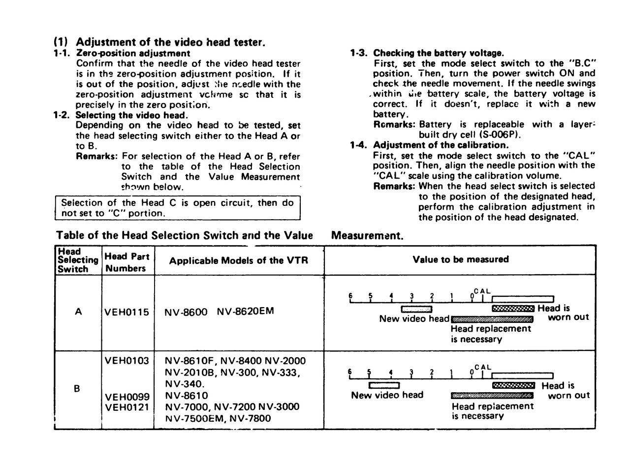 Хоть прибор и предполагается для использования с кассетными видеомагнитофонами из списка в инструкции, его можно применять и для замеряя любых других видеоголовок. Нужно лишь сравнение с заведомо рабочими головками той же типовой конструкции и можно считать замеры успешными. О точности речи не идет, задача прибора — выяснить, пригодна ли видеоголовка для использования в видеомагнитофоне или она сточена/сколота и не может быть использована.