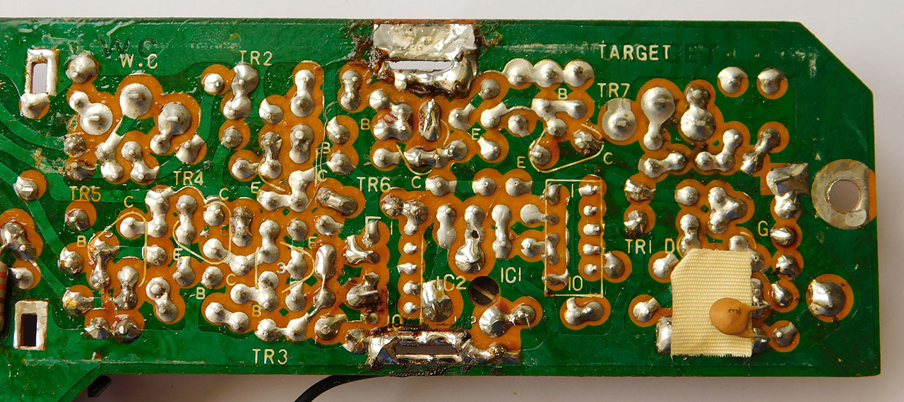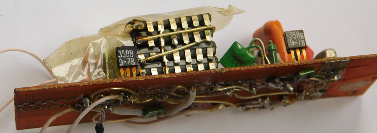 Необходимость создания синхрогенератора также заключается в том, что советские катушечные видеомагнитофоны формируют сигналы синхронизации, которые не подходят к камерам от Panasonic. Форма импульсов отличается. Вот так и создали плату синхрогенератора в советские времена. Построена она на основе кварцевого генератора на микросхемах 155-логики, на нескольких счетчиках. Микросхемы спаяны бутербродом для уменьшения занимаемого места. Синхрогенератор сначала работал, но позже "испортился" выходной транзистор строчных синхроимпульсов — КТ358. Как и свойственно КТ358, он вызванивается электрически, но в схеме работать уже не способен. Заменяется на 2N3904 или 2N5551, из советских аналогов можно заменить на КТ315.