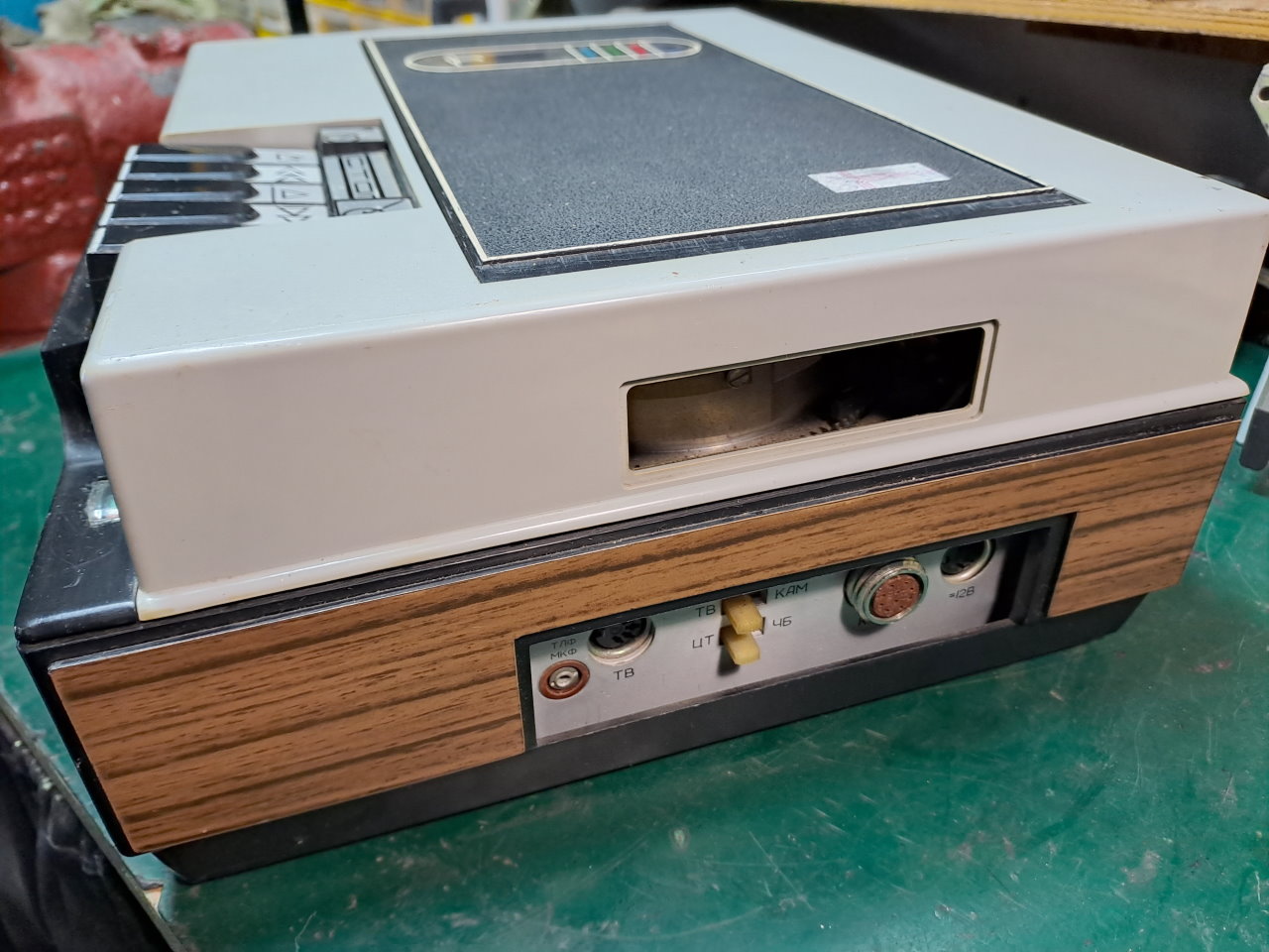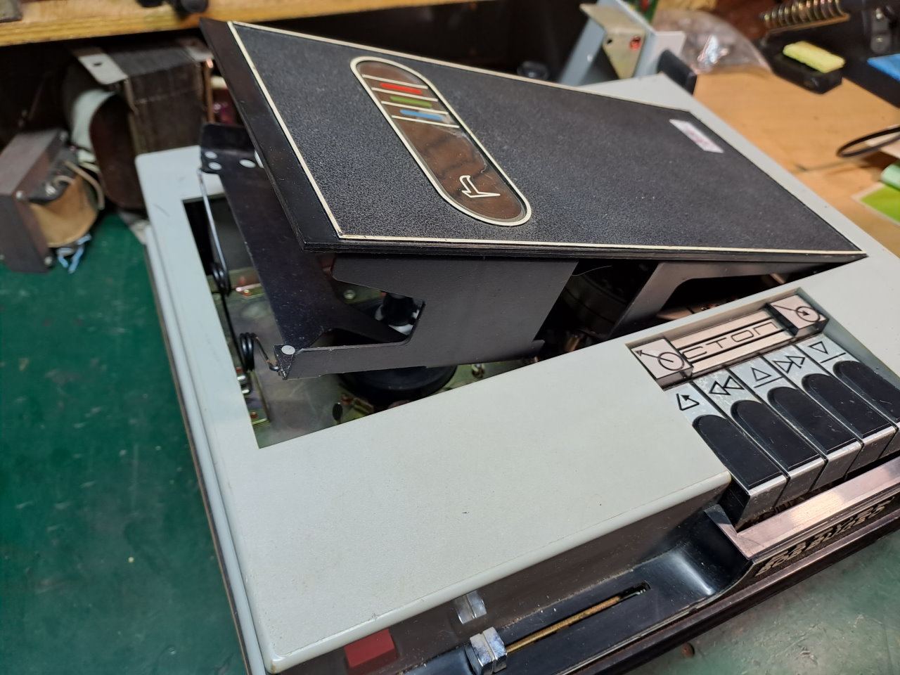 Первично видеомагнитофон был включен после распаковки. Первый раз в движение приводились только БВГ и привод подкатушечников. Тонвал был закисший, так же как и механизм заправки-расправки. Вручную провернув эти узлы, они заработали. На плате управления мотором заправки пропал контакт в движке подстроечного резистора, который устанавливал ток, при котором двигатель отключается. В этом видеомагнитофоне нет концевиков на определение конечных положений ЛПМ в состоянии заправлено/расправлено, вместо этого есть схема, измеряющая ток двигателя заправки и отключающая его, при превышении определенного значения.