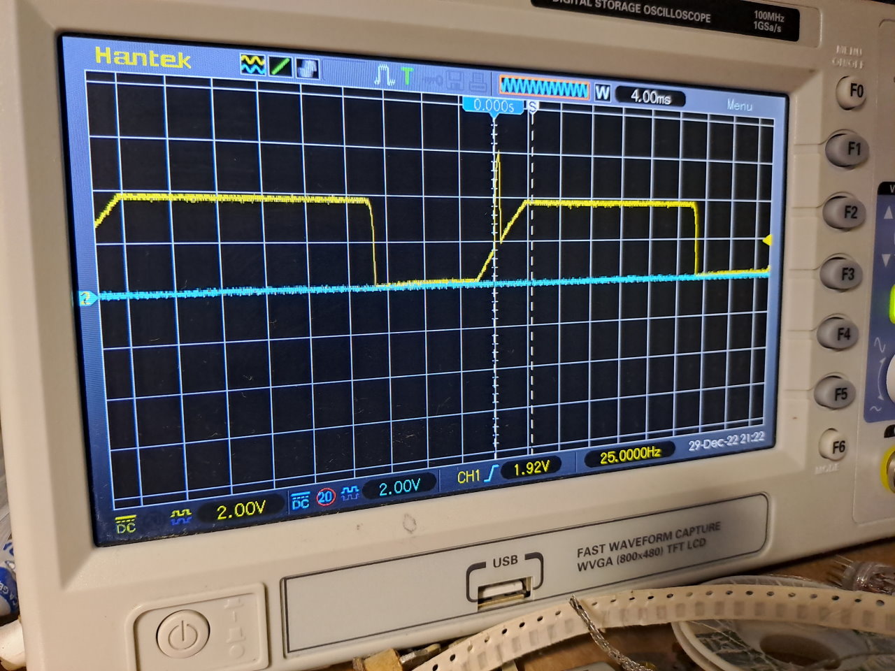 Следующим шагом с помощью осциллографа была сделана попытка посмотреть "палку на склоне", которая олицетворяет собой работу систему автоматического регулирования по фазе и частоте. В этом видеомагнитофоне применена такая же плата синхронизации как и в катушечном видеомагнитофоне Электроника 508-Видео. Здесь две одинаковых системы синхронизации: по БВГ, и по тонвалу. По тонвалу сигнал можно посмотреть только при проигрывании записи с ленты или при включении записи. БВГ в данной схеме синхронизации синхронизирован от кварца, поэтому "палка на склоне" будет в режиме воспроизведения. На осциллограмме было видно, что трапеция ("склон") правильная, палки (сигнал с таходатчика) имеется, но схема не может поймать фазу. Оказалось, что подстроечный резистор, который устанавливает захват фазы, попросту сломан.
