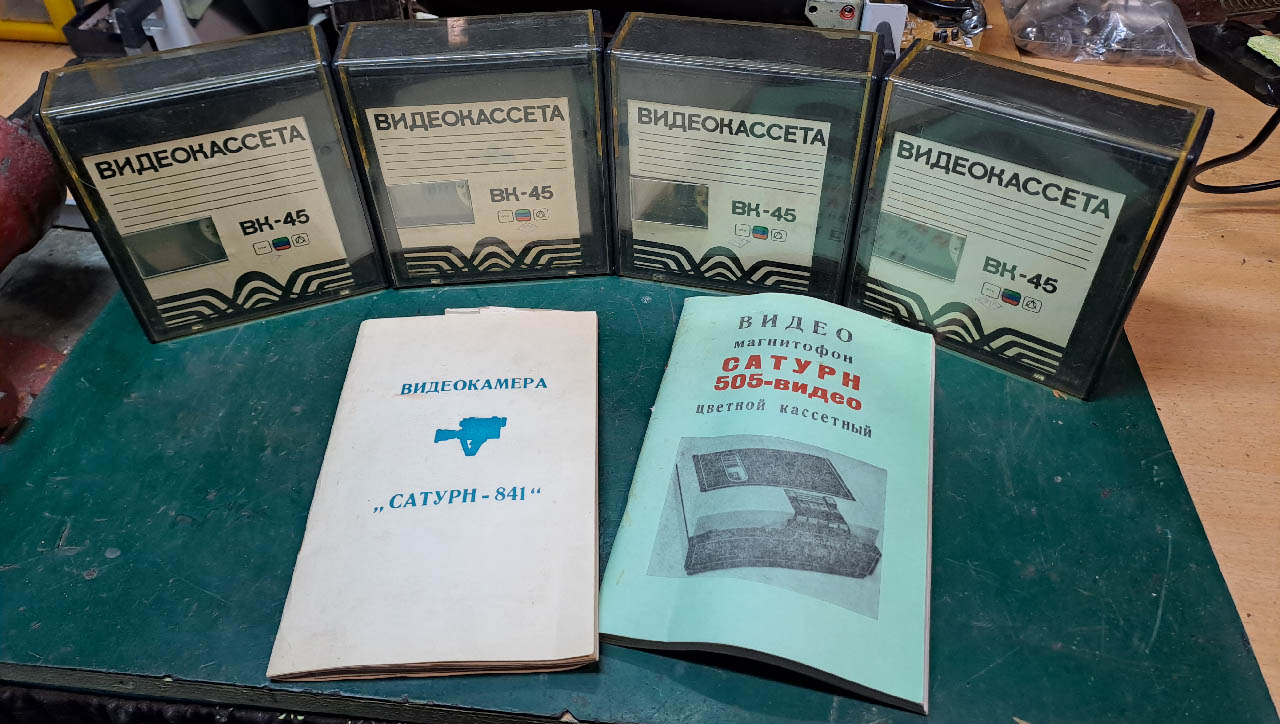 Данный видеомагнитофон куплен на Авито. Видеомагнитофонов в лоте было несколько, предположительно 7 комплектов. В комплект входил собственно сам видеомагнитофон, видеокамера Сатурн-841, а также кассеты ВК-45 и блок питания для видеомагнитофона. Комплекты быстро были раскуплены за месяц, мне в комплекте не досталось блока питания, зато продавец положил четыре видеокассеты ВК-45, а также инструкцию по эксплуатации.