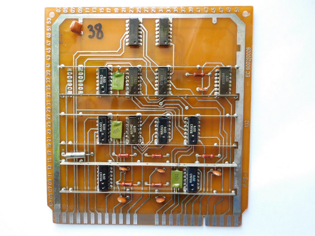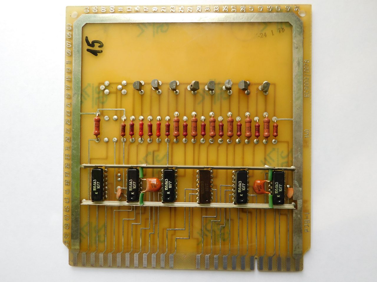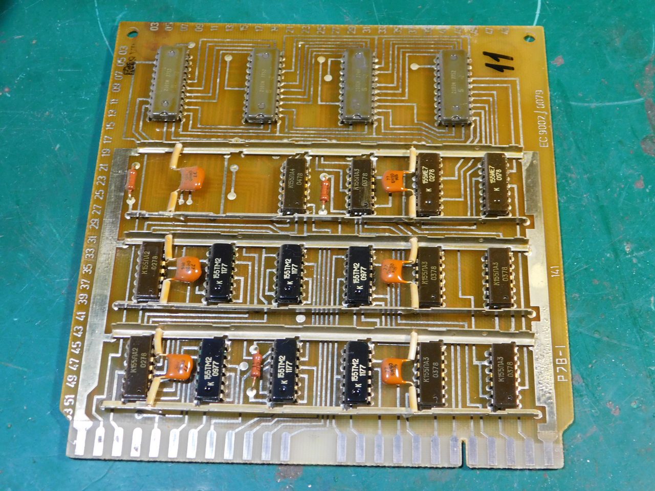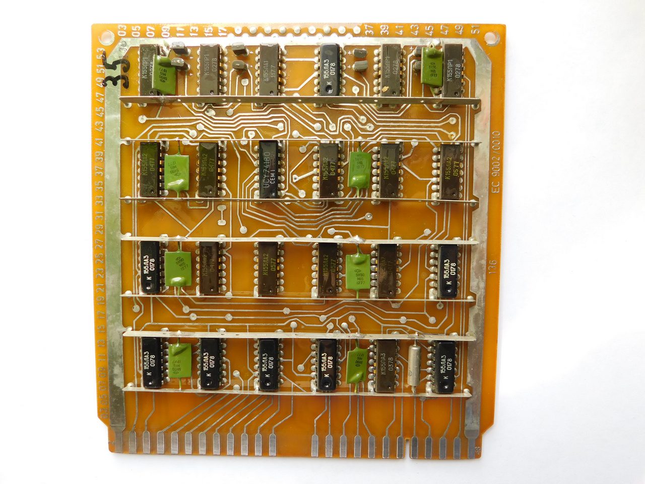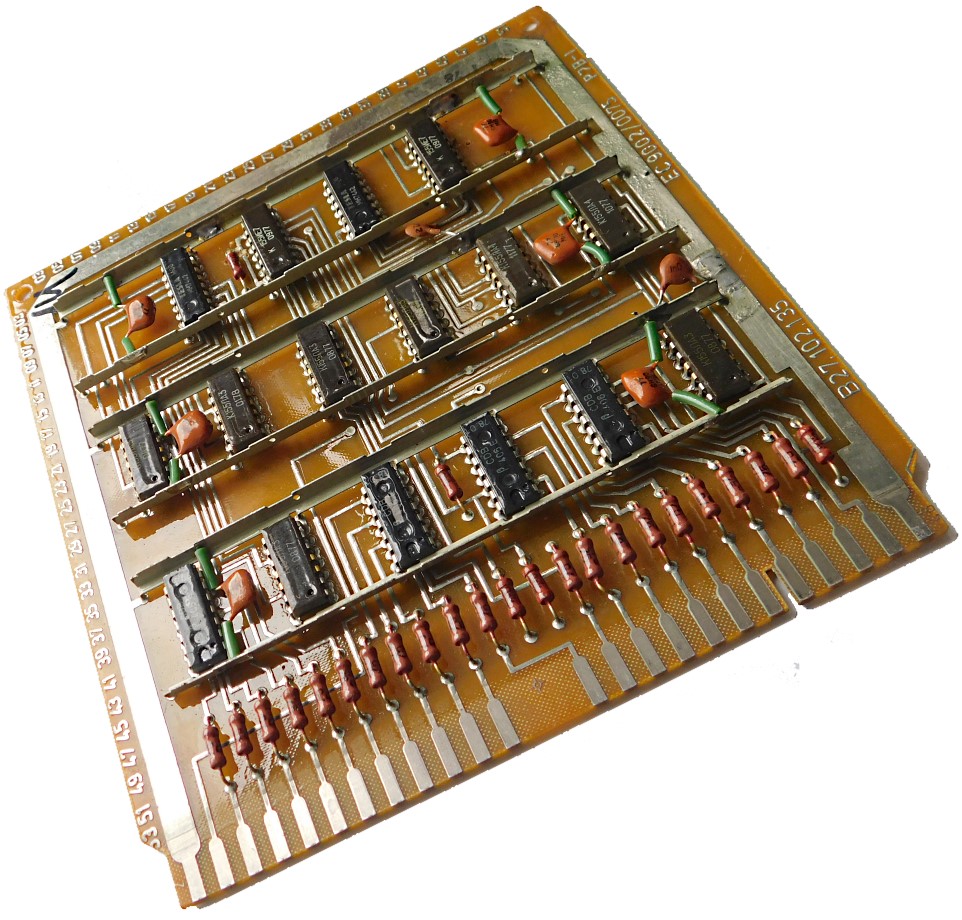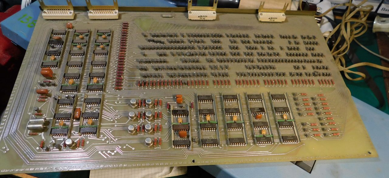Пример платы. Номенклатура электронных компонентов ограничивается микросхемами стандартной TTL логики советского и производства соц.стран. Транзисторы и диоды в основном несоветского производства. Питание к каждой микросхеме подводится с помощью шины, которая напаяна над платой и на которую запаиваются блокировочные конденсаторы. Это стандартная практика в платах от ЭВМ и устройств Единой Серии (ЕС). По размерам эта плата является стандартной для машин ЕС и соответственно может быть вставлена в любое другое устройство, так как имеет ту же конструкцию разъема.