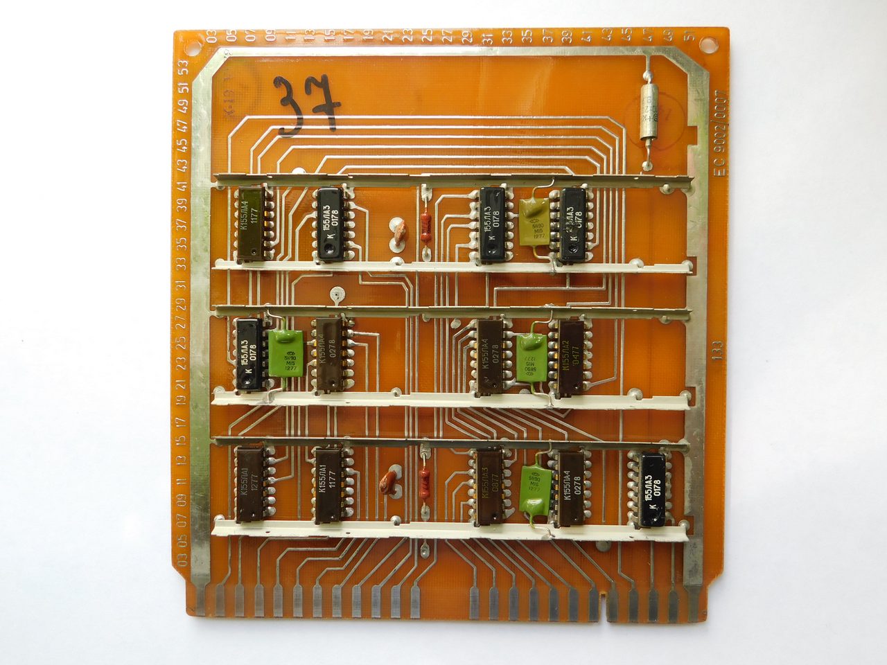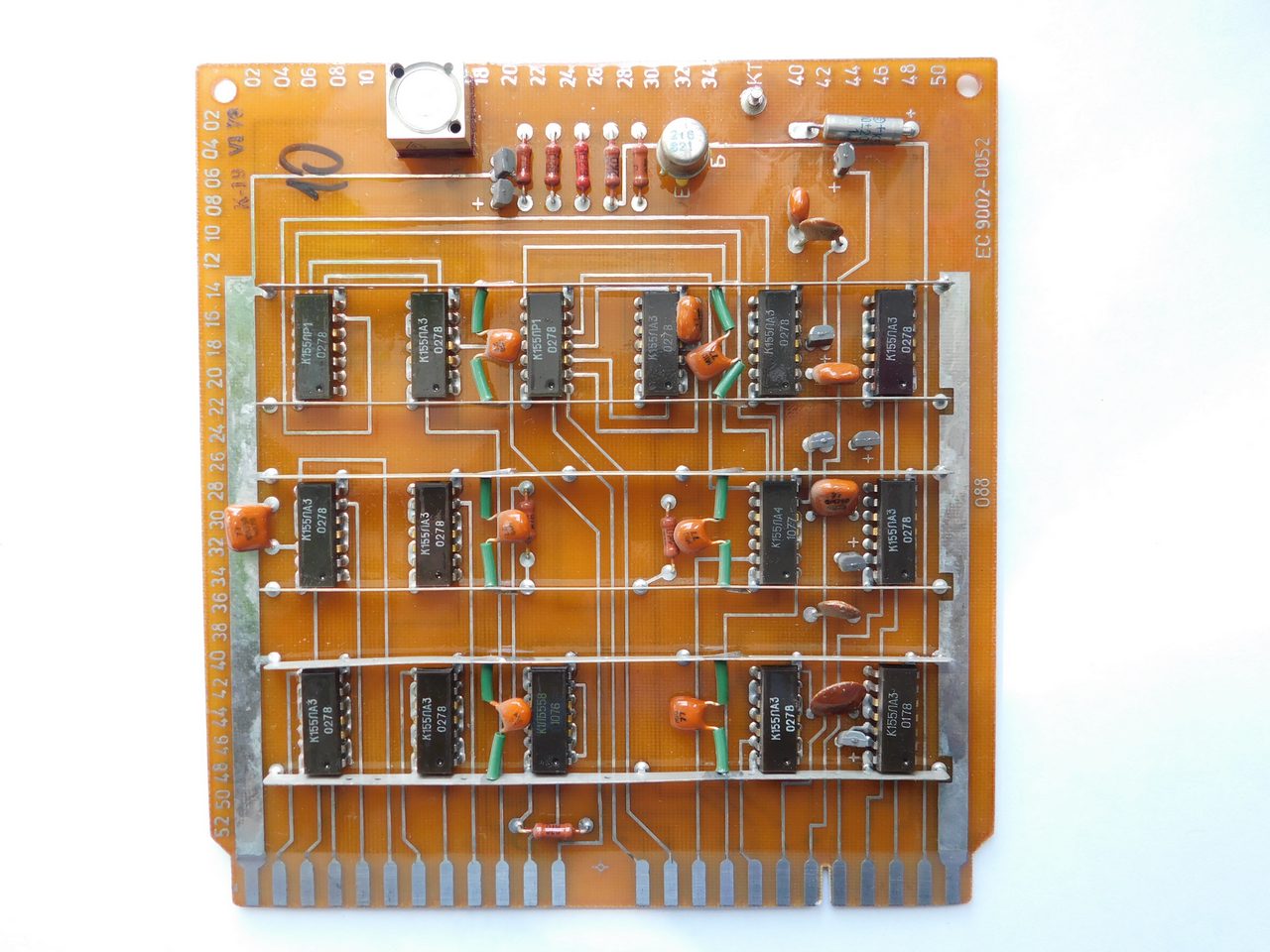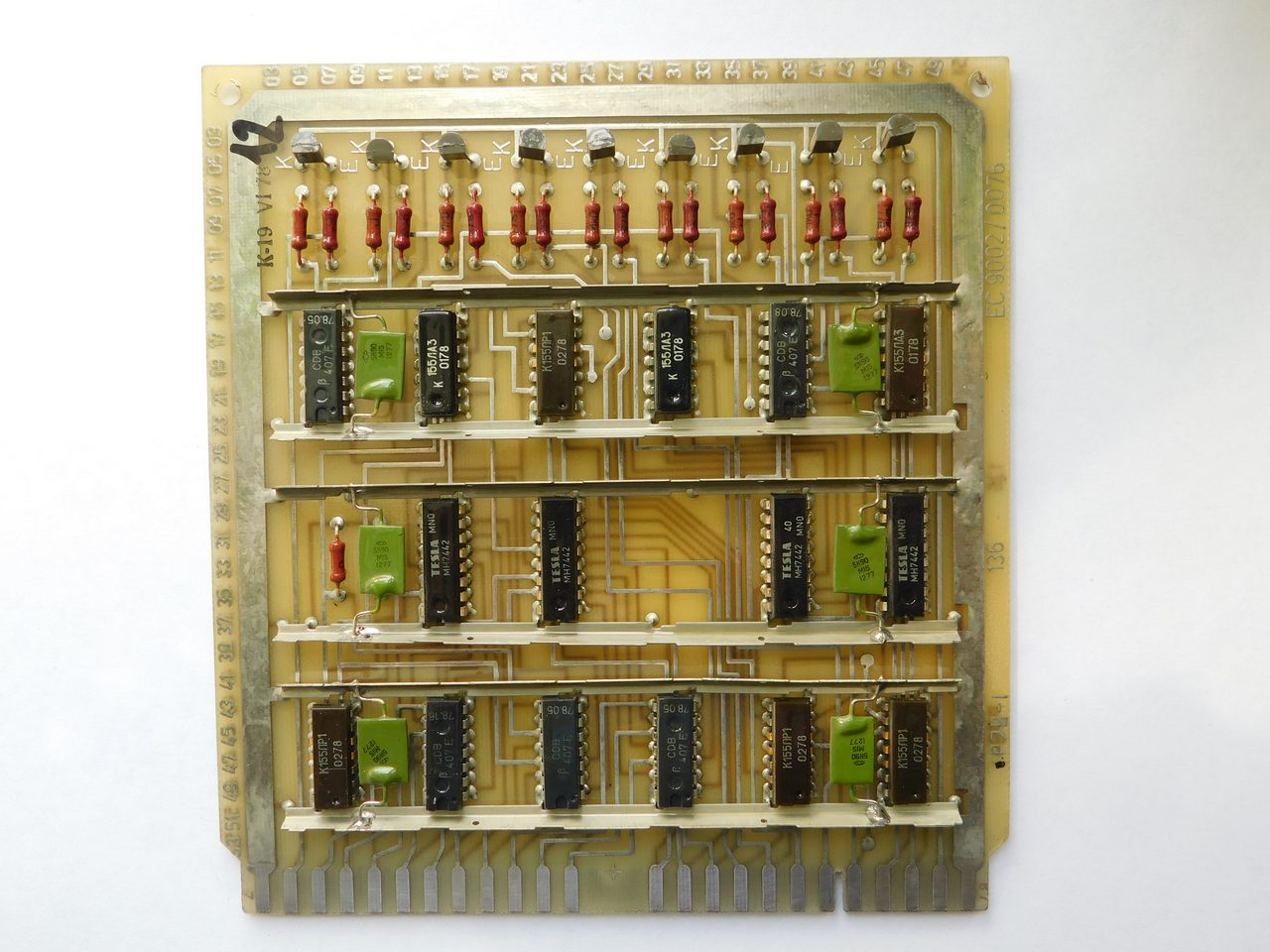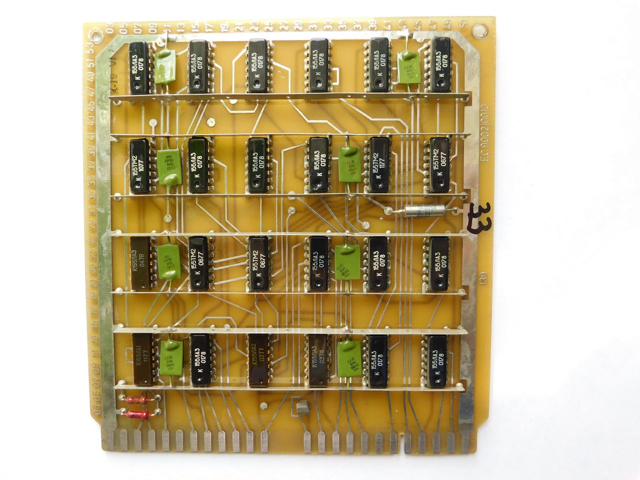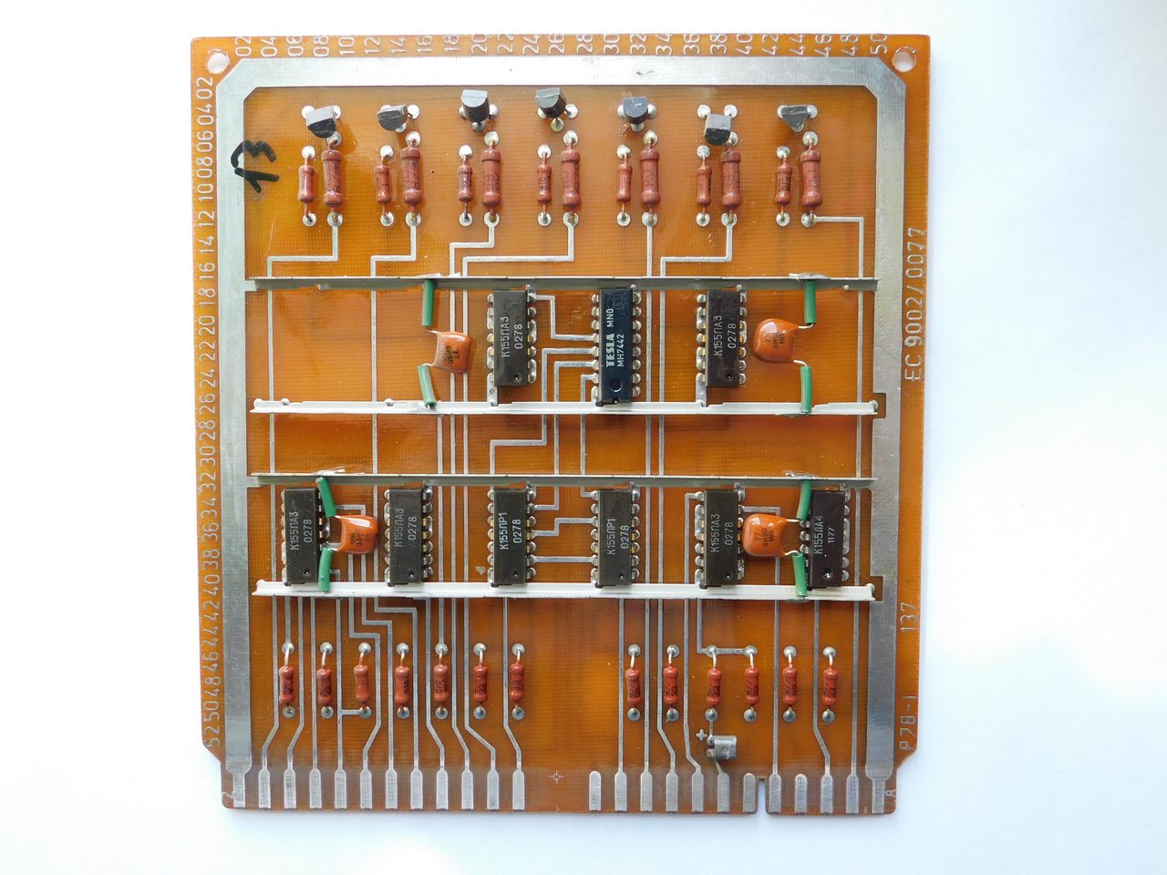Пример платы. Номенклатура электронных компонентов ограничивается микросхемами стандартной TTL логики советского и производства соц.стран. Транзисторы и диоды в основном несоветского производства. Питание к каждой микросхеме подводится с помощью шины, которая напаяна над платой и на которую запаиваются блокировочные конденсаторы. Это стандартная практика в платах от ЭВМ и устройств Единой Серии (ЕС). По размерам эта плата является стандартной для машин ЕС и соответственно может быть вставлена в любое другое устройство, так как имеет ту же конструкцию разъема.