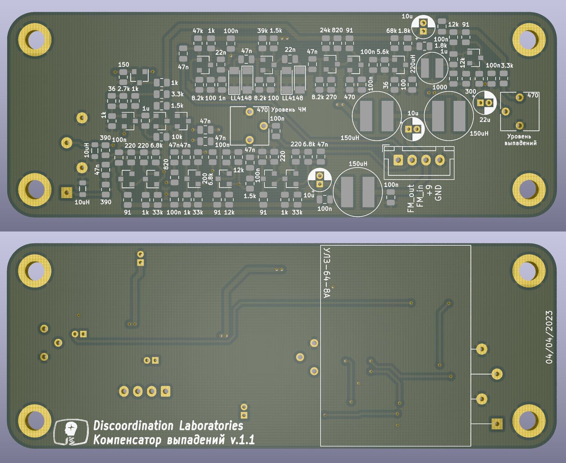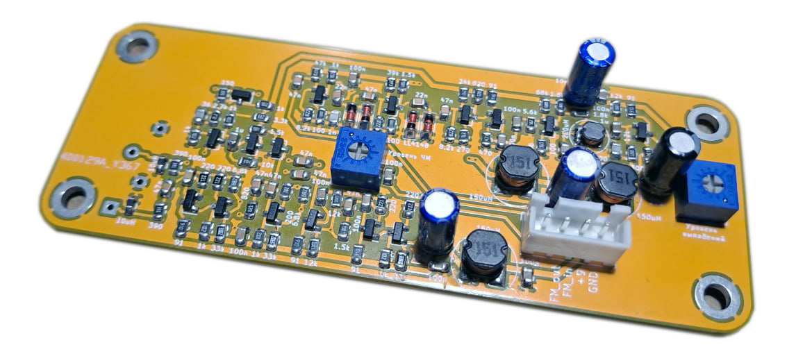 Список деталей для сборки компенсатора представлен внизу страницы. Данный компенсатор почти полностью состоит из SMD-компонентов, выводные лишь несколько электролитических конденсаторов и разъем для подключения. Линия задержки УЛЗ 64-8А крепится на двухсторонний скотч и припаивается через проволочки к контактам на плате. На печатной плате детектор выпадений расположен сверху, усилители снизу. Имеется лишь две регулировки: уровень ЧМ-сигнала на выходе компенсатора и уровень выпадений, при котором срабатывает детектор.