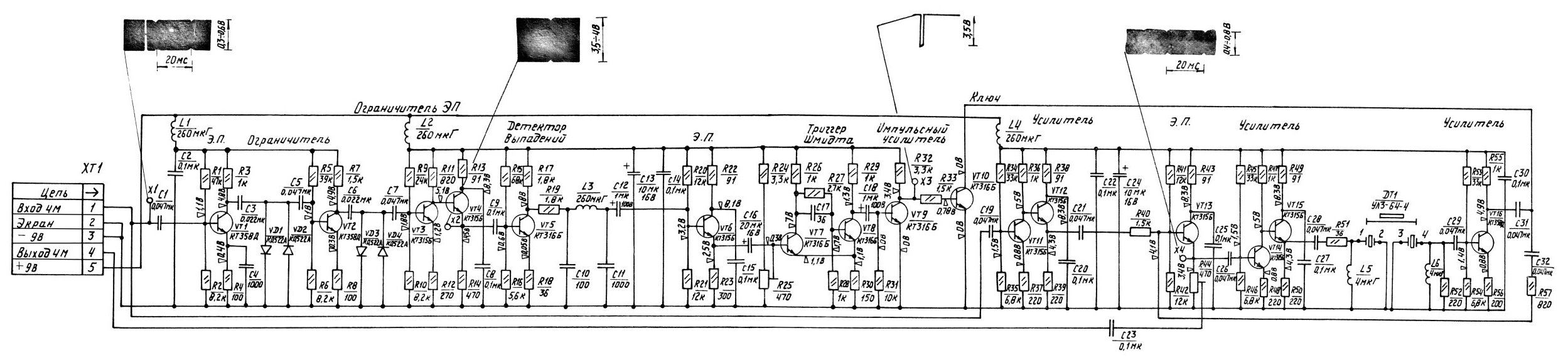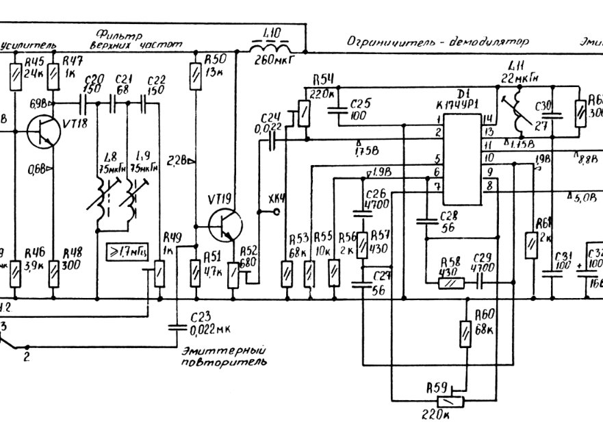 Вторая половина схемы состоит из усилителей для согласования со входом и выходом линии задержки. Сигнал со входа приходит на усилитель на транзисторах VT11-VT12, с него на ЭП на VT13. VT13 также является и выходом компенсатора. В цепь эмиттера включен подстроечный резистор R44, в ползунка которого снимается выходной сигнал. Также с эмиттера через конденсатор C26 ЧМ-сигнал поступает на усилитель записи на транзисторах VT14-VT15. Нагрузкой его является собственно ультразвуковая линия задержки УЛЗ 64-4.