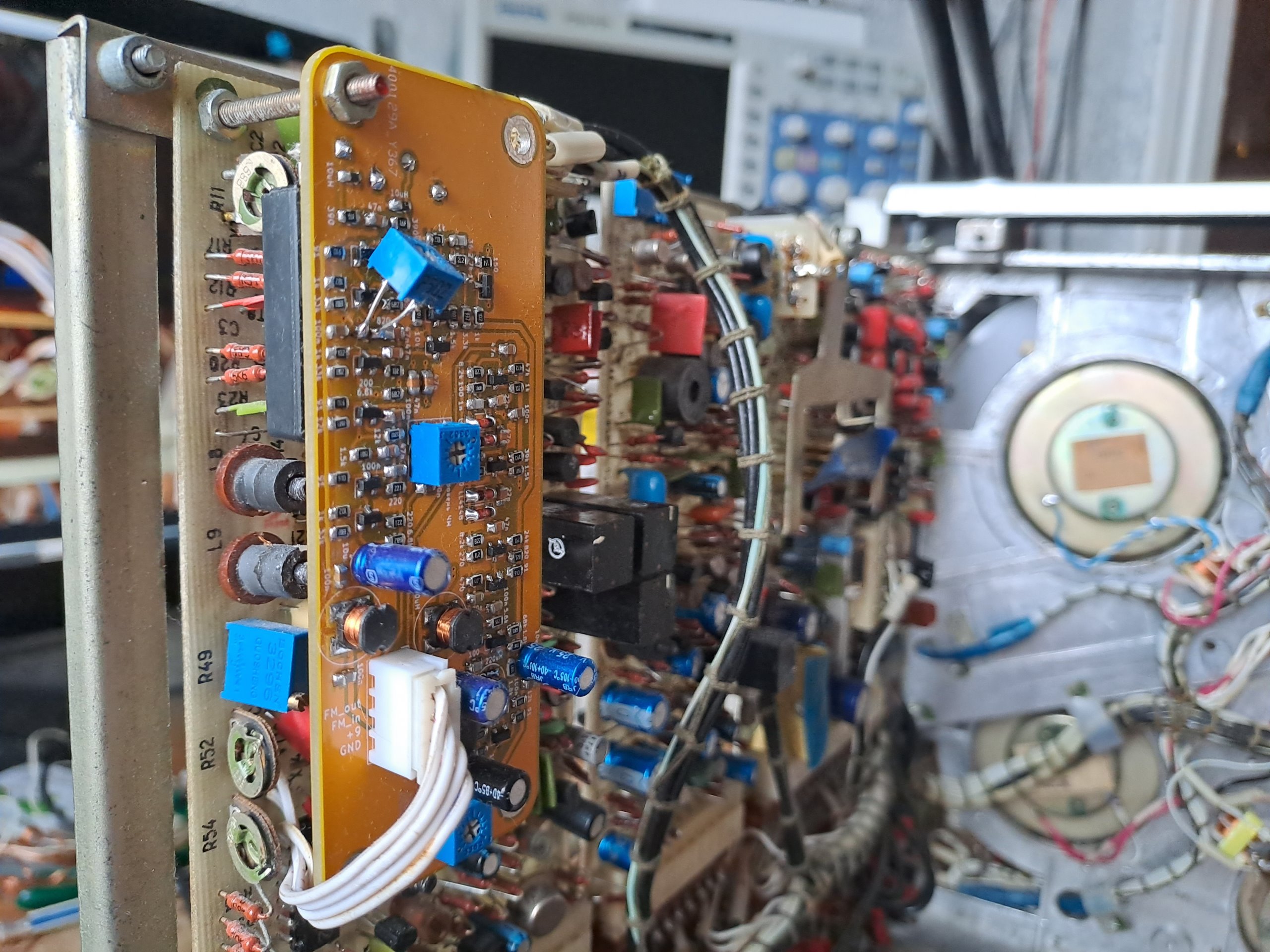 На практике при первом запуске схемы пришлось также подстраивать резистор R57. Он задает амплитуду замещенного ЧМ-сигнала. В первый раз я собрал с номиналом, который указан на оригинальной схеме, но на практике оказалось, что замещенный сигнал сильно больше по амплитуде, чем исходный. Для видеомагнитофона это оказалось неприемлемо, вместо замещенного сигнала были черные полосы. В представленной схеме R57 показан с уже подобранным сопротивлением. Однако, если будет виден разбег в амплитуде на осциллографе (если синхронизировать осциллограф от импульса детектора), то можно подстроить этот резистор, чтобы выровнять уровни замещенного и исходного ЧМ-сигналов.