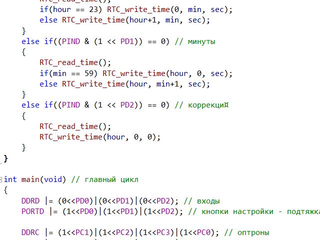 Программирование. Весьма специфический этап. Тот момент, когда твой девайс оживает с залитием прошивки, которую прежде долго и муторно писал в Atmel Studio 6. С прошивкой было множество трудностей, часы никак не хотели работать так как надо. На индикаторы выводилась ерунда, динамическая индикация не работала. А все оказалось просто и банально - я неправильно работал с портами, совсем неправильно. Обнулял не правильно, из-за чего выводилось не то, что нужно. Так или иначе, с индикацией разобрался, но связи с микросхемой часов реального времени не было. Пришлось разбираться с шиной I2C и даташитом на DS3231...