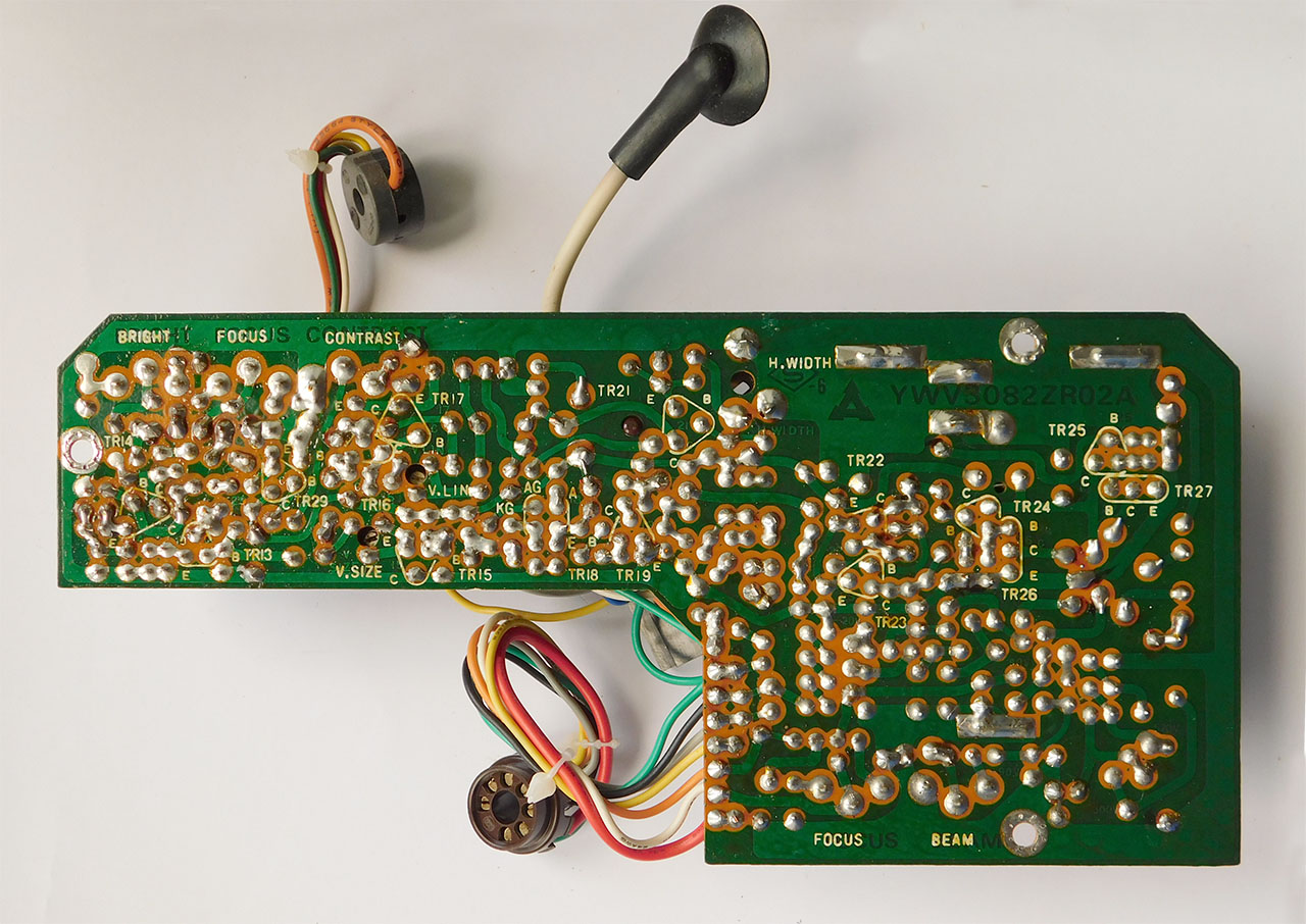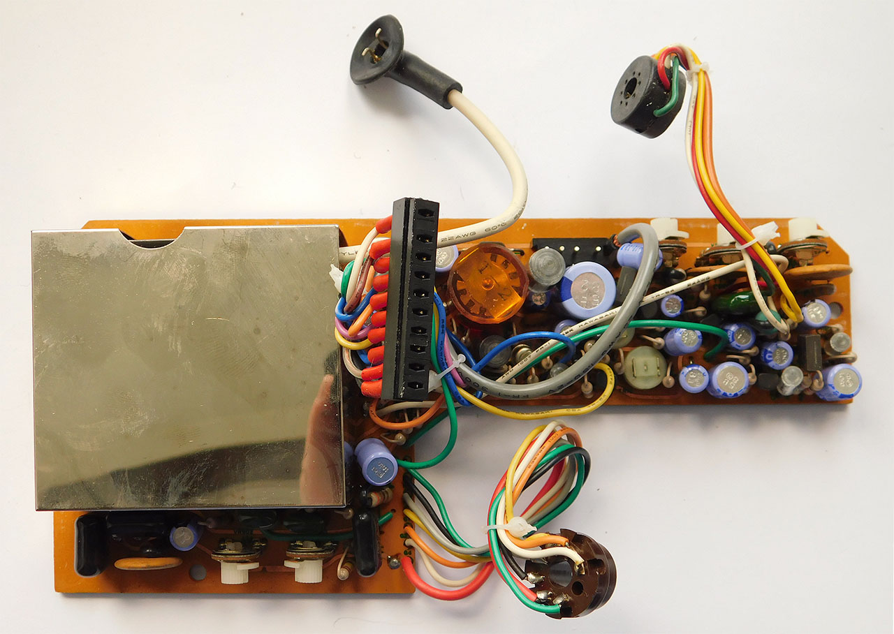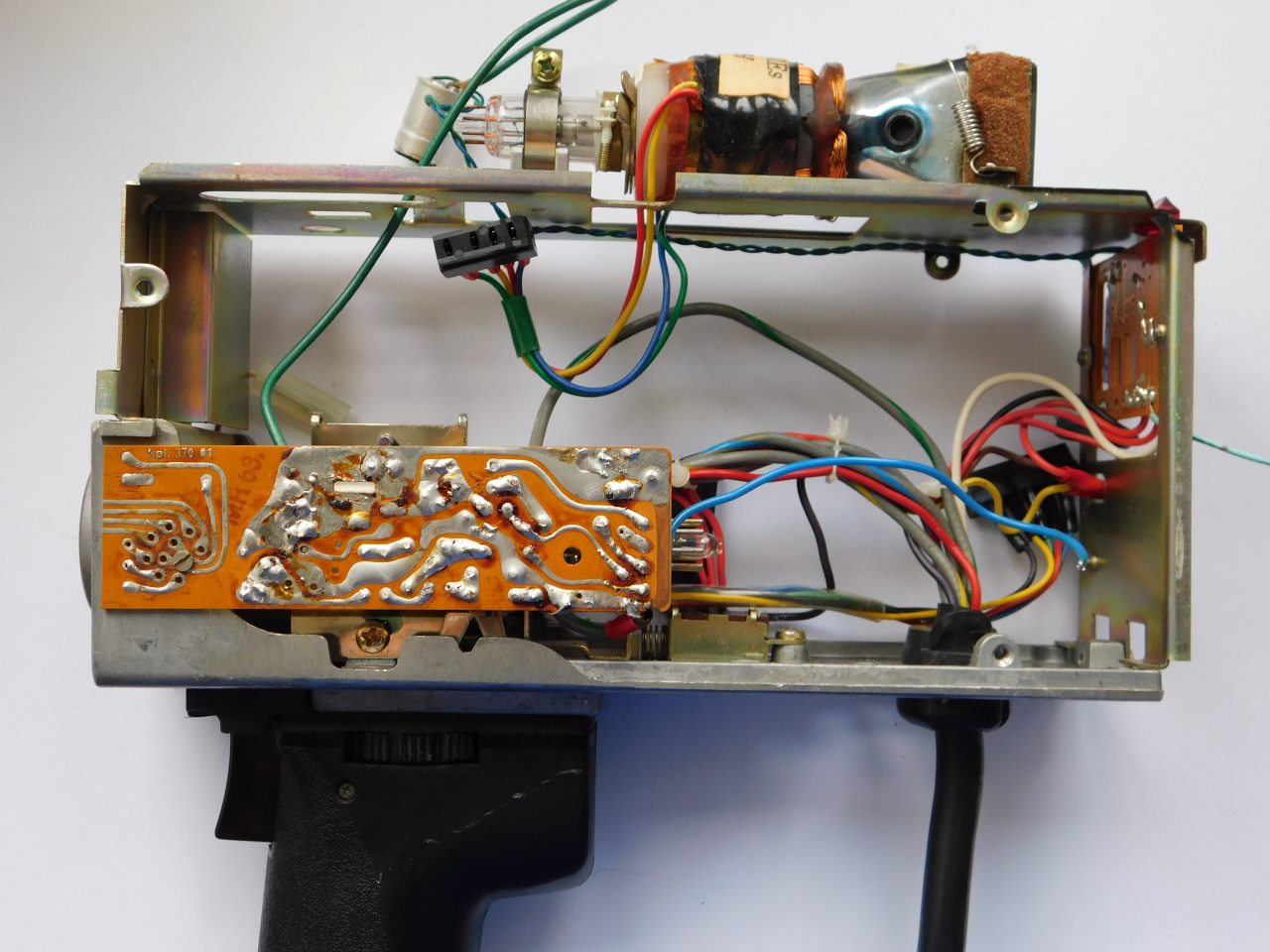 Печатные платы с электроникой не откидываются, но это никак не уменьшает удобства в ремонте: все регуляторы в доступности, а сами печатные платы подключаются с помощью разъемов. Печатных плат всего две. Первая плата содержит блок питания камеры и схему видоискателя, а вторая плата содержит видеоусилитель и усилители разверток. Соответственно плата разверток безопасна для случайного прикосновения, а на плате блока питания имеются высокие напряжения (может "покусать").