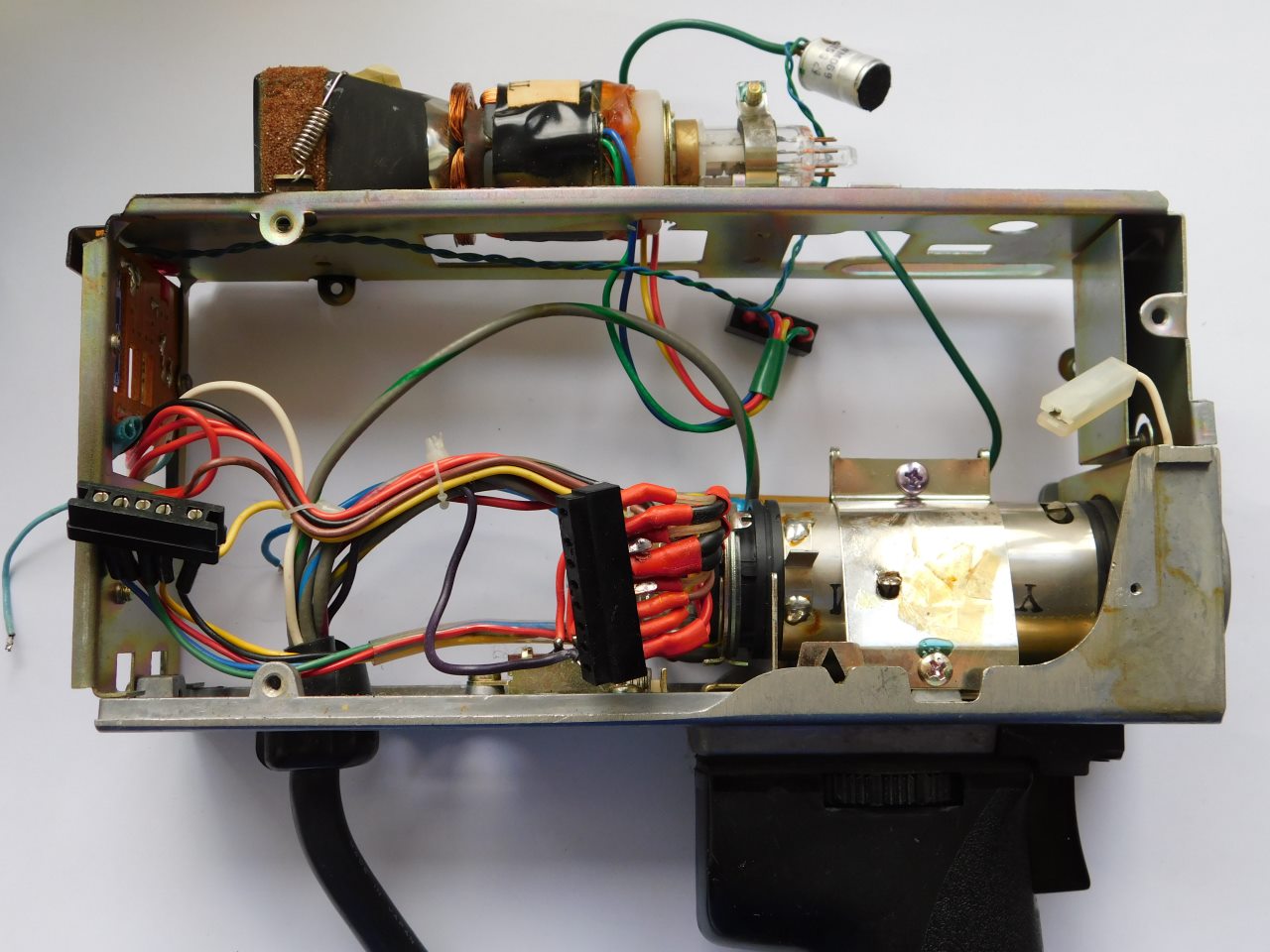 Видеокамера разбирается просто: снизу три винта и один винт крепит видоискатель. После этого корпус видеокамеры разбирается на три части: две боковые крышки и крышка видоискателя. Видоискатель здесь встроенный, его нельзя снять как в Электронике 822. После снятия кожуха трубка видоискателя останется сверху. Нужно быть очень осторожным при обращении с этой видеокамерой в разобранном виде — маленький кинескоп легко сломать, никакой защиты у него нет.