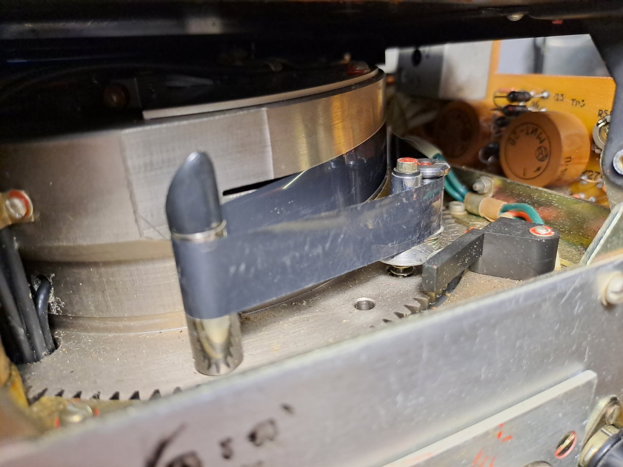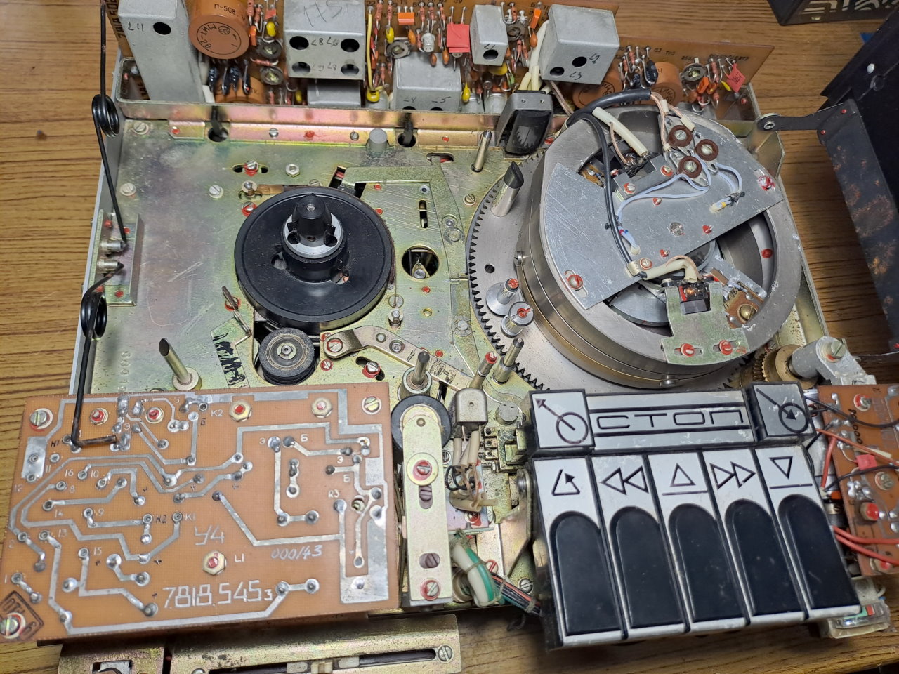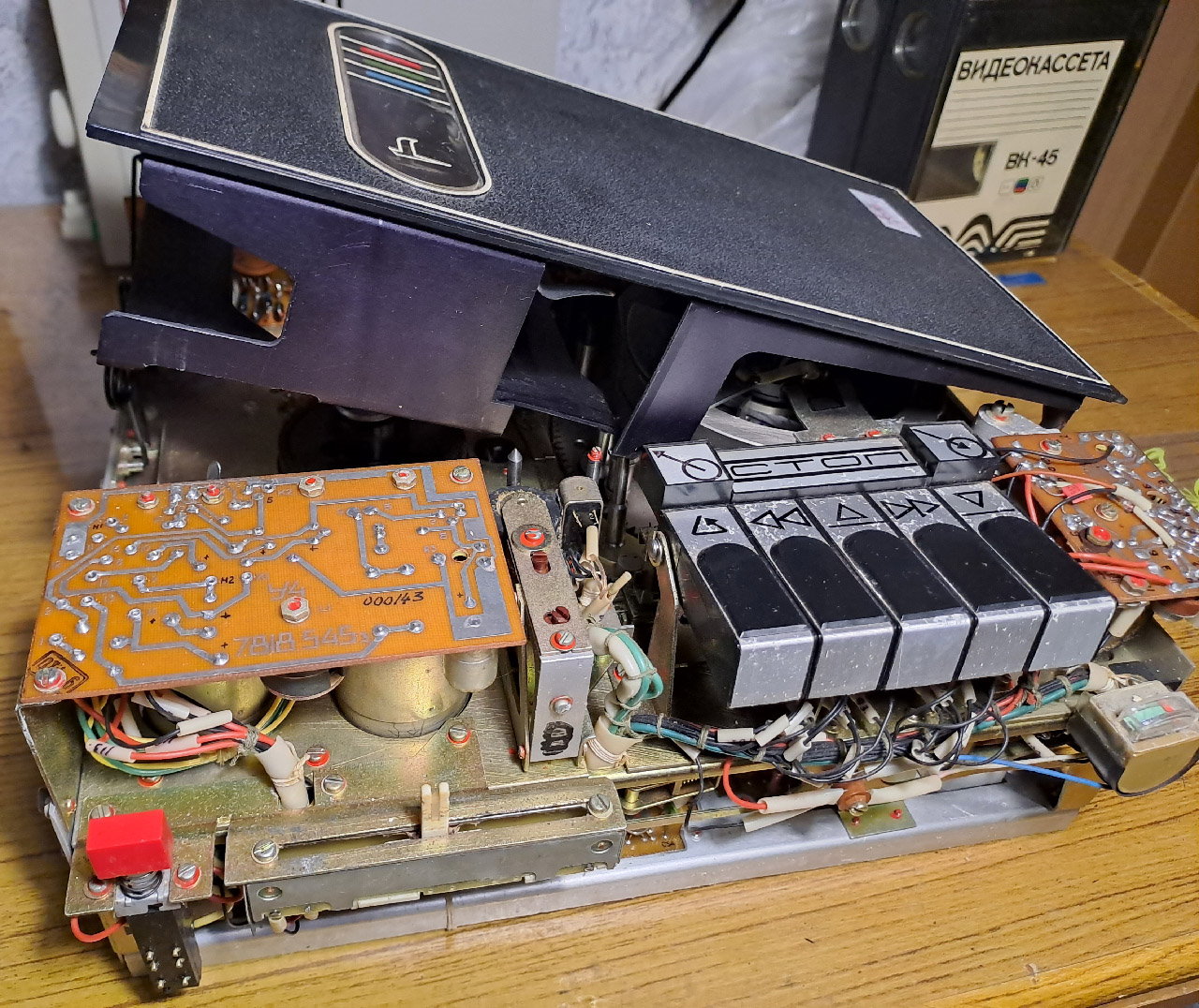 Первично видеомагнитофон был включен после распаковки. Первый раз в движение приводились только БВГ и привод подкатушечников. Тонвал был закисший, так же как и механизм заправки-расправки. Вручную провернув эти узлы, они заработали. На плате управления мотором заправки пропал контакт в движке подстроечного резистора, который устанавливал ток, при котором двигатель отключается. В этом видеомагнитофоне нет концевиков на определение конечных положений ЛПМ в состоянии заправлено/расправлено, вместо этого есть схема, измеряющая ток двигателя заправки и отключающая его, при превышении определенного значения.